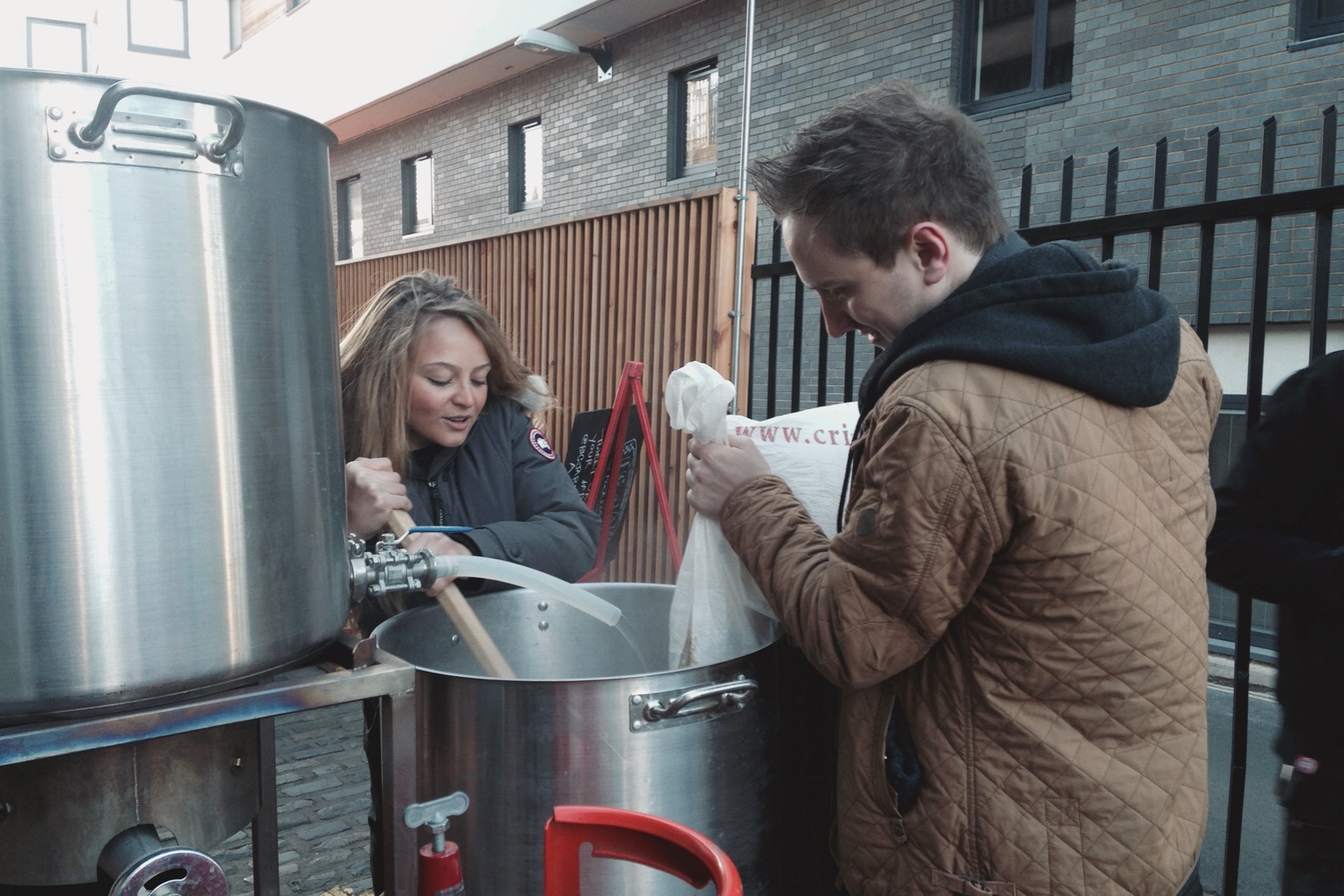 The brew day carries on apace and it's time to add the hops to our now boiling wort. The pellets fizz and explode as they hit the surface of the water each releasing its characteristic aromas as it does. We retire back to the bar for pizza and Horse and Dragons highly accomplished IPA, arguably there's no better food pairing, especially on a brew day. Even at lunch Cornish is dashing back to check the boil every few minutes, summoning me when it's time for the next hop addition. Once the boil is finished and it's stood for a few minutes after the aroma hops have been added, it's time to run the beer into the fermenter. Here I witness Cornish pitch yeast in line with the wort as it leaves the heat exchanger which she does using a modified keg to contain her yeast. She tells me that this gets fermentation started quicker, I'd never seen this done before but I sure took her word for it.